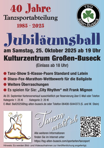 In diesem Jahr feiert die Tanzsportabteilung der TSG Alten-Buseck ihr 40-jähriges Bestehen. Am Samstag, dem 25. Oktober 2025 findet ab 19 Uhr im Kulturzentrum Großen-Buseck, ein Jubiläumsball statt.