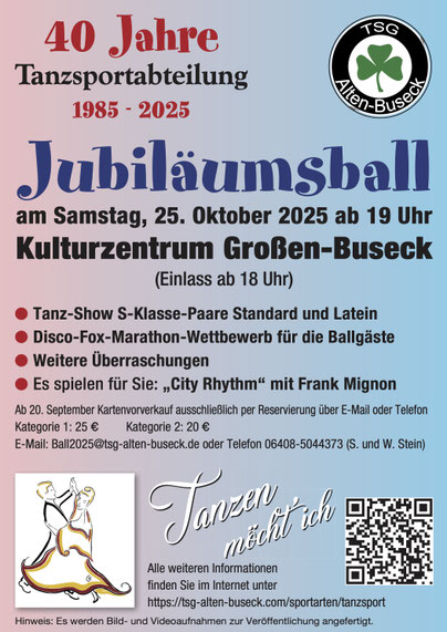 Die Veranstalterin (Tanzsportabteilung der TSG Alten-Buseck) weist darauf hin, dass Fotos und Videos gemacht werden, auf denen Teilnehmer und Zuschauer zu erkennen sind, und dass diese in der Presse, im Internet und sozialen Medien veröffentlicht werden sollen. Ansprechpartnerin: Daniela Grimm.